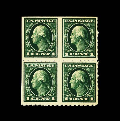 661 nhbl 408 var. image#408 var., 1c Green, imperforate, "Kansas City" roulettes variety, vertically imperforate between, a most unusual and rare variety of the "Kansas City" roulette, being a pristine mint block of four which has no rouletting vertically between the two rows (also no roulettes at left, but full roulettes at right), nicely centered, rich color, o.g., n.h., very fine; the first such error we have seen; signed and accompanied by a 2001 PF certificate. (Image) Est. 400-500