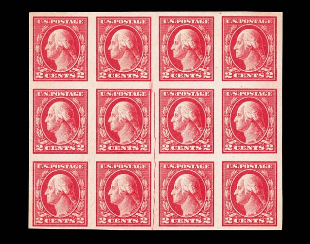 662 ogbl 409 var. image#409 var., 2c Carmine, imperforate, cracked plate, mint block of twelve (4 x 3) showing a very pronounced cracked plate between the middle stamps of columns two and three, large margins all around, bright color, o.g., n.h. except two stamps at top l.h., extremely fine; a wonderful Scott listed item for the Washington-Franklin specialist. (Image) Est. 100-150