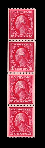 664 og/nh 411 image#411, 2c Carmine coil, Ty. I, perf. 8 1/2 horiz., guide line strip of four, beautifully centered, rich luxuriant color, o.g., end stamps l.h., center line pair n.h., extremely fine; 1979 PF certificate. (Image) 112.50