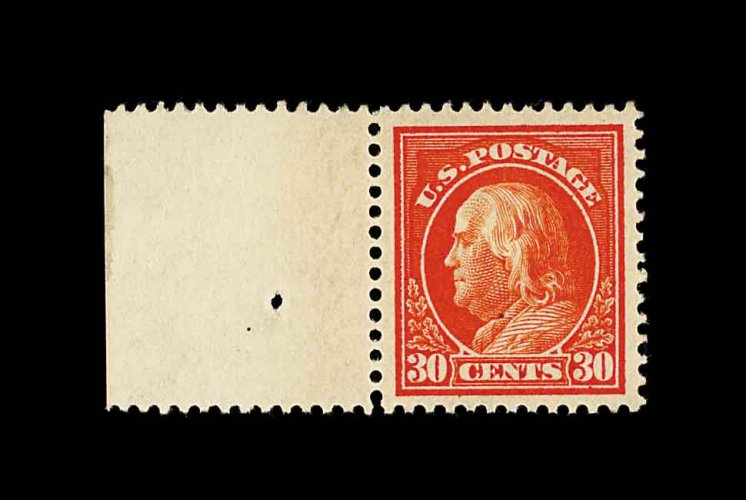 673 nh 420 image#420, 30c Orange red, a most impressive left sheet-margin mint single which possesses outstanding eye appeal, boasting enormously large and wonderfully well balanced margins all around, plus its color is strikingly intense and its impression razor-sharp on bright crisp paper, pristine o.g., n.h., an extremely fine gem in every regard; 1980 PF certificate. (Image) 220.00