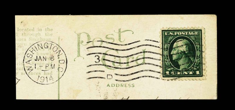 678 O 424a image#424a, 1c Green, perforated 12 x 10, exceptionally well centered, deep rich color, tied to small piece of post card by complete "Washington, D.C./Jan 8, 1914" machine postmark, piece has vertical folds on either side of stamp but not affecting it in any way, a very fine and choice example of this rare compound perforation variety which, according to Johl, only approximately 20 are thought to exist; the date on this piece is most intriguing, as the earliest known usage of the normal perf. 10 variety is October 21, 1914, which this usage predates by nine months, this disparity deserves further study and research; 1955 APS certificate. (Image) 2,500.00