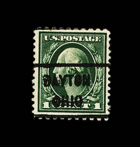 679 O 424b image#424b, 1c Green, perforated 10 x 12, marvelously well centered within large margins, deep rich color on bright fresh paper, bold "Dayton/Ohio" precancel as almost always, extremely fine for this rarity, of which less than 50 were ever found; quite likely one of the finest examples known; 1984 PF certificate. (Image) 2,250.00