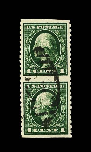 680 O 424c image#424c, 1c Green, vertical pair, imperforate horizontally, wonderfully well centered within large margins, strong rich color and a deeply etched impression on bright paper, duplex cancel, extremely fine; a very rare used example of this perforation error; 1964 PF certificate; ex-Stollnitz. (Image) 750.00