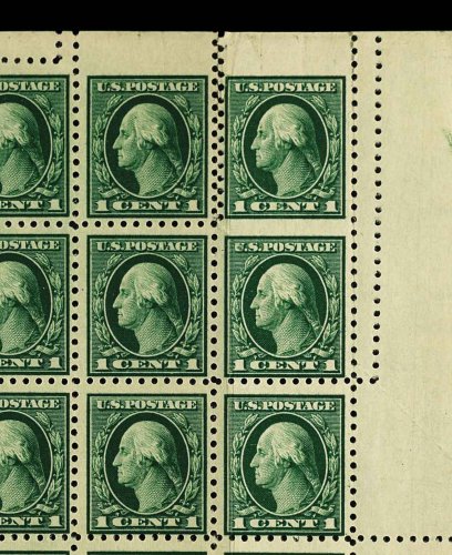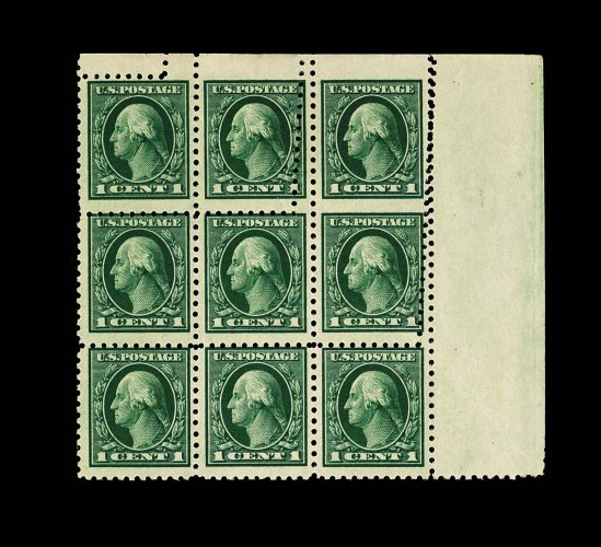 681 nhbl 424f image#424f, 1c Green, vertical pair, imperforate between and at top, a top right corner sheet-margin block of nine (3 x 3), displaying a fold over at top right, resulting in the creation of the very rare imperforate between error, the top center stamp in the block is also imperforate at top as a result of the fold over, centered to top, o.g., n.h., a few creases (which obviously created the error), couple of inconsequential perf. separations, very fine; one of only two known examples of this important Washington-Franklin error rarity, both of which have been certified as genuine by the Philatelic Foundation, and both are currently owned by Mr. Floyd (see next lot); 1987 PF certificate. (Image) 5,500.00