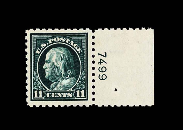 691 nh 434 image#434, 11c Dark green, gem right sheet-margin plate no. 7499 single, featuring outstanding centering amid huge margins, gorgeous prooflike color and impression on brilliantly white paper, full and intact perforations, o.g., n.h., extremely fine. (Image) 40.00
