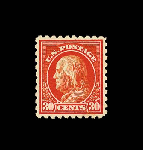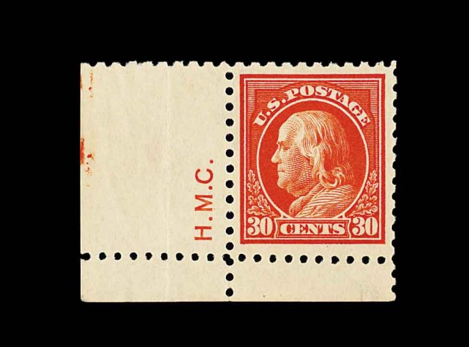 696 nh 439 image#439, 30c Orange red, an incomparable bottom left corner sheet-margin mint single, showing sideographer's initials in the sheet selvage, perfectly centered amid lavishly large margins, striking intense color and a deeply etched impression on bright paper, pristine o.g., n.h., vertical crease of little importance in the sheet selvage, extremely fine; an eye-arresting gem that is certain to realize a record price; 1983 and 2000 PF certificates. (Image) 425.00