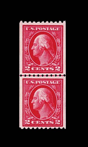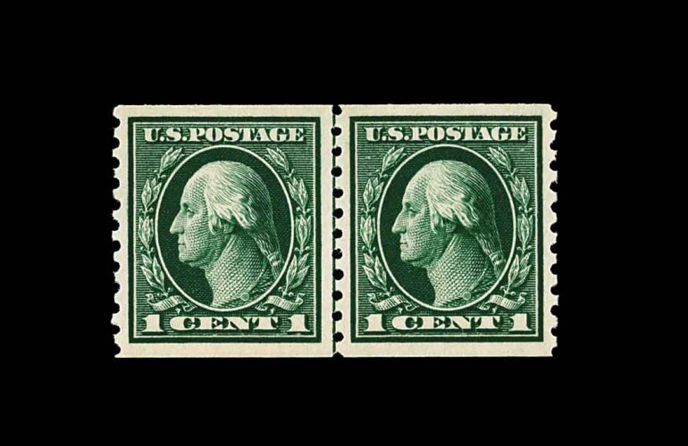 700 nh 443 image#443, 1c Green flat plate coil, perf. 10 vert., guide line pair, exceptionally well centered and margined, deep luxuriant color and impression on immaculate paper, o.g., n.h., extremely fine; a select quality line pair; 1982 PF certificate. (Image) 240.00