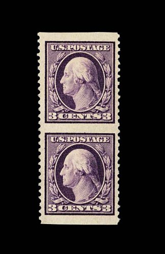761 nh 502c image#502c, 3c Dark violet, Ty. II, vertical pair, imperforate horizontally, extraordinarily well centered within very large margins, wonderfully fresh color and paper, o.g., n.h., extremely fine; certainly one of the finest of the reported 40 to 50 error pairs; signed E. Klein and accompanied by a 1993 PSE certificate. (Image) for hinged 350.00