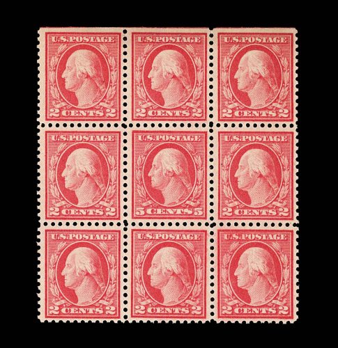 764 nhbl 505 image#505, 5c Rose error, single error in a block of nine, brilliantly fresh and bright, lovely rich color, outstanding centering for this popular error multiple, pristine o.g., n.h., couple of vertical perfs. separated at top, extremely fine; actually quite difficult to find in this premium condition. (Image) 1,050.00