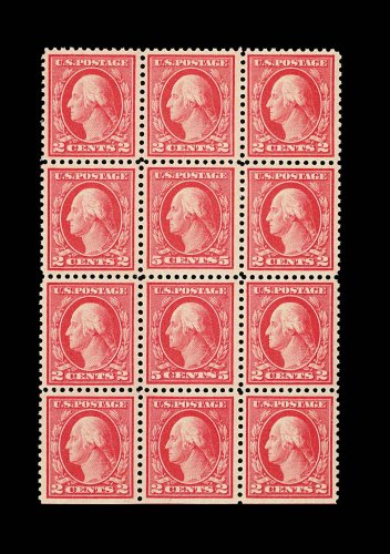 765 nhbl 505 image#505, 5c Rose error, double error in a block of twelve, incredibly well centered throughout, including both error stamps which are especially choice, rich color, pristine o.g., n.h., extremely fine; a gem example of the double error; particularly scarce and desirable in this outstanding condition. (Image) 2,100.00