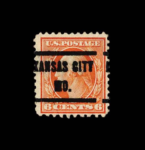 766 O 506a image#506a, 6c Red orange, perforated 10 at bottom, bold "Kansas City/Mo." precancel, intense vibrant color, nicely centered, couple of mild corner creases at bottom left not mentioned on accompanying certificate, otherwise very fine for this enormously rare perforation variety of which only ten have been certified by the Philatelic Foundation; clear 1976 PF certificate. (Image) 2,250.00