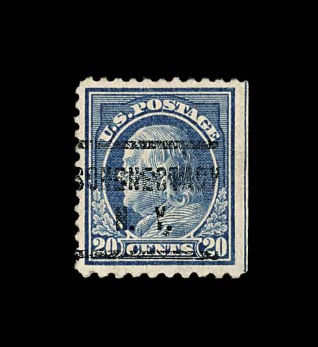 772 O 515d image#515d, 20c Light ultramarine, perforated 10 at bottom, a choice used example of this enormously rare perforation error, wonderfully well centered within large margins, natural s.e. at right, bright rich color on fresh paper, light "Schenectady/N.Y." precancel, very fine; the recent sale of Thurston Twigg-Smith's used collection (Robert A. Siegel Auction Galleries, Inc., April 2001) contained a slightly soiled and creased example of this rarity, and despite the aforementioned faults it realized $10,500.00, plus the 10% buyer's premium; 2001 PF certificate. (Image) 4,500.00
