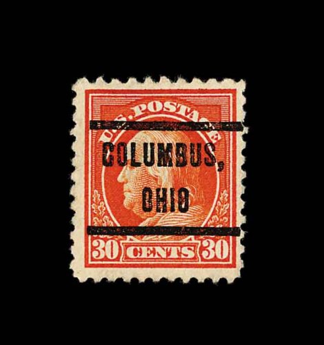 773 O 516a image#516a, 30c Orange red, perforated 10 at top, crisp central "Columbus,/Ohio" precancel, wonderfully well centered within very large margins, strikingly intense color on bright paper, without any faults which affect so many of the rare perforation errors of this series, a very fine and choice example of this immensely rare stamp; according to our records this is the only used example known, and there are only two mint examples recorded; listed but unpriced used in Scott, a mint single catalogs $5,000.00; 1984 APS and 1997 PF certificates. (Image) as mint 5,000.00