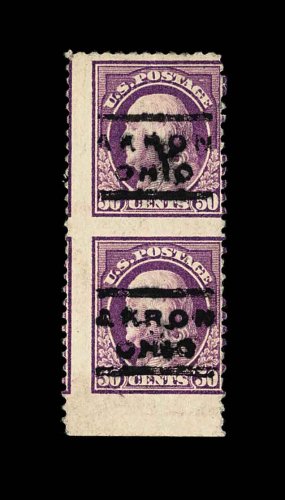 774 O 517b image#517b, 50c Red violet, vertical pair, imperforate between and at bottom, a used bottom sheet-margin pair of this highly important Washington-Franklin error, with "Akron/Ohio" precancels on each stamp, strongly shifted vertical perforations causing pair to be centered into the perforations at right (may be related to the production problem which caused the missing perforations), light diagonal crease at top left; despite the Scott catalog listing both a mint and used pair of this error, this is the only certified example in the Philatelic Foundation records and the only one known to us; according to the P.F., three mint pairs and another used pair were submitted in the past but all were determined not to be genuine errors, leaving this as the only certified "genuine" example of Scott #517b; 1975 and 2000 PF certificates. (Image) 7,000.00