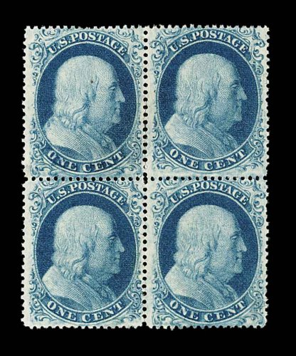 62 ngbl 18, 20 image#18, 20, 1c Blue, Ty. I and II combination block of four, positions 37-38/47-48L12, unused, the top left and bottom right stamps being Type I stamps (the latter showing a double transfer), other two are Type II stamps, magnificently centered, with each stamp in the block featuring uncharacteristically large and well balanced margins, bright color and an unusually clean impression for Plate 12, top left stamp with trivial inclusion speck not mentioned on the accompanying certificate, an extremely fine and very rare One Cent Blue Plate 12 multiple; 1990 PF certificate. (Image) 7,000.00