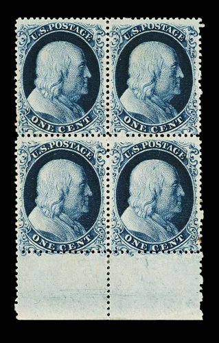 63 ogbl 19, 19b, 22 image#19, 19b, 22, 1c Blue, Ty. IIIa/IIIa/Ia/Ic combination block of four, positions 85-86/95-96R4, a brilliantly fresh mint bottom sheet-margin block of four, the top stamps being Type IIIa, while the bottom left stamp is the enormously rare Type Ia, and the bottom right stamp is Type Ic, incredibly intense color and a truly prooflike impression on pristine paper, full clean o.g. that has been lightly hinged, minor perf. strengthening in selvage, bottom right stamp with two insignificant tone specks, very fine. An impressive and exceedingly rare combination block, containing a choice example of one of the rarest mint stamps in all of United States philately - the One Cent Blue 1857 Type Ia. In fact, we believe the mint Type Ia contained in this block is one of the finest quality original gum examples known among the scant few recorded, as this stamp could not be more brilliantly fresh and crisp, nor its original gum more pristine. An exciting showpiece either for the One Cent 1857 issue specialist, or for the collector of mint United States stamps wishing to obtain a mint example of one of the most challenging U.S. stamps. Accompanied by a 1993 PF certificate; ex-Caspary, Lilly and Ishikawa. (Image) 50,000.00