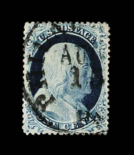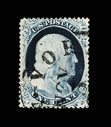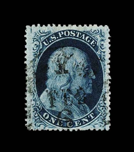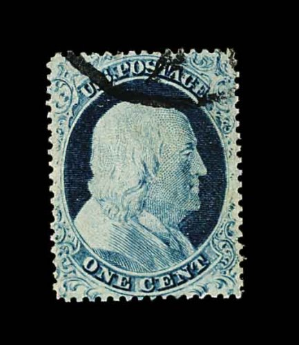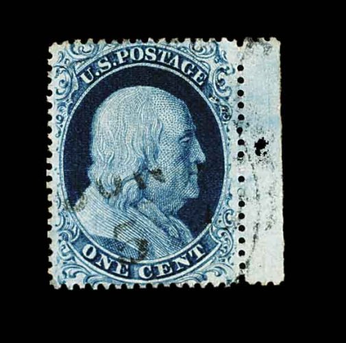 75 O 24 var. image#24 var., 1c Blue, Ty. Va, gem used example of this surprisingly elusive type, possessing all of the classic characteristics unique to this type, with fabulously intense color and a great impression showing the nearly complete side ornaments, wonderfully well centered within huge margins only seen on plate 5 stamps, New York town c.d.s., extremely fine; terribly undercataloged in our opinion for a "normal" very fine stamp, let alone in this outstanding quality; 1992 PF certificate. (Image) 120.00