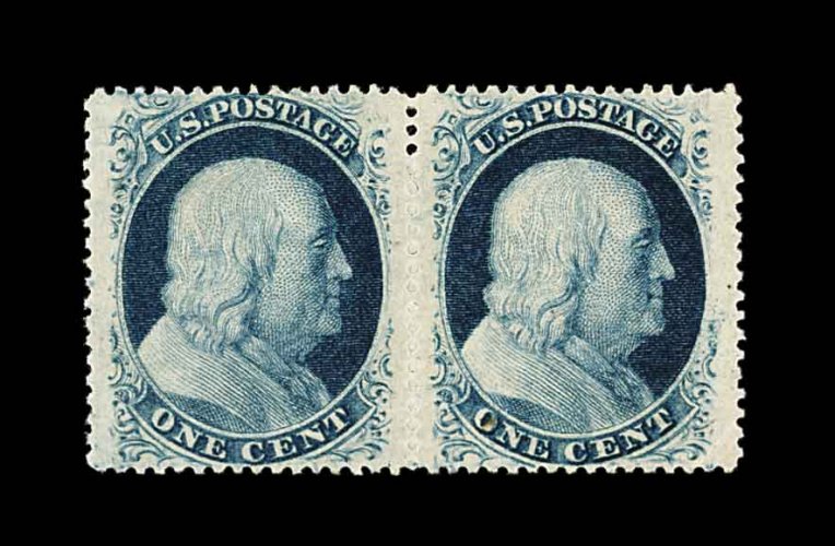 74 og 24 image#24, 1c Blue, Ty. V, horizontal pair, brilliantly fresh, bright color, extraordinarily well centered and margined, full o.g., lightly hinged, right stamp with faint corner crease not mentioned on accompanying certificate, extremely fine; clear 1990 PF certificate. (Image) 375.00