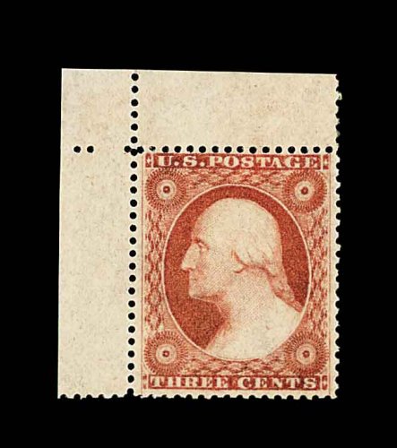 77 nh 26 image#26, 3c Dull red, Ty. II, pristine top left corner sheet-margin mint single, possessing an overall "post office" freshness, with gorgeous color and impression on immaculate paper, outstanding centering and margins, unblemished o.g., never hinged (l.h. in selvage only), extremely fine; an impressive stamp; 1987 PF certificate. (Image) for hinged 75.00