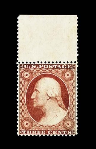 78 nh 26 var. image#26 var., 3c Claret, "post office" fresh top sheet-margin mint single of this distinctive and undervalued shade, with rich unmistakable claret color on fresh crisp paper, outstanding centering, o.g., never hinged, extremely fine and striking; 1998 PF certificate specifically identifying this as the claret shade. (Image) for hinged 170.00
