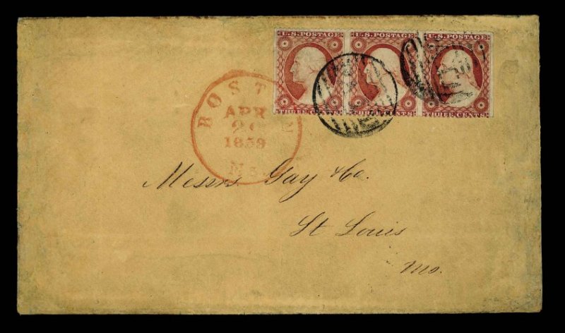 80 c 26af image#26af, 3c Dull red, Ty. IIa, imperforate vertically, an impressive horizontal strip of three nicely tied to an attractive cover to St. Louis by two strikes of large black "Paid" grids and a red "Boston, Ms./Apr 20, 1859" c.d.s., sealed tear in left stamp, cover with repaired backflap and minor edge tears, very fine appearance; the unique listing example added to the Scott catalog just within the past few years after this cover made its first appearance at auction in years in 1997 (Robert A. Siegel Auction Galleries, Inc. "Rarities" sale), there is one other Type IIa imperforate vertically stamp known (ex-Piller collection), however it is only a single and, of course, having a multiple such as this is a more desirable format to display the perforation error; its $8,250.00 realization in 1997 is the basis for its current catalog value; a highly desirable cover for either the 1851-57 Issue specialist or for the serious collector of classic United States errors; 1950 (photocopy) and 1997 PF certificates. (Image) 8,250.00