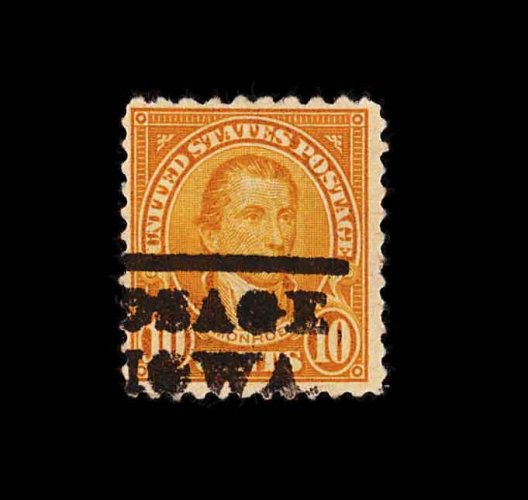 821 O 562c image#562c, 10c Orange, perforated 10 at top, portion of "Osage/Iowa." precancel, deep luxuriant color, very fine for this extremely rare perforation variety, with only a very small number thought to exist; 1960 PF certificate. (Image) 2,250.00