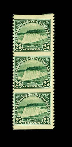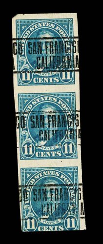 822 O 563d image#563d, 11c Light blue, imperforate, vertical strip of three, clear "San Francisco/California" precancels, large margins on three sides, slightly in at bottom, some insignificant minor wrinkling, very fine; one of only two known imperforate multiples of this stamp, this being the larger and finer of the two; the other known multiple is a pair with similar San Francisco precancel (ex-Lilly) and is almost completely separated by scissors, this strip of three was discovered in the early 1980s, and since that time no other imperforate multiples have surfaced; one of the most important error rarities in United States philately and an essential addition to a gold-medal exhibition collection of the 1922-29 Regular issue series; 1983 PF certificate. (Image) 17,500.00