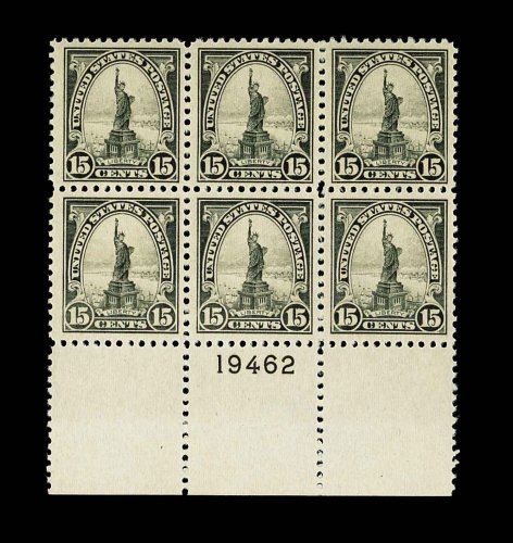 825 nhX 566 image#566, 15c Gray, full bottom margin plate no. 19462 block of six, marvelously fresh and bright, strong intact perforations, each stamp being exceptionally well centered and margined, o.g., n.h., extremely fine. (Image) 340.00