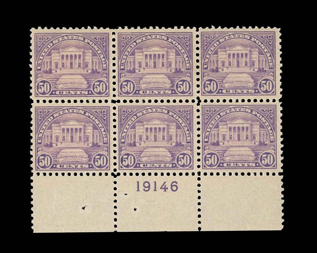 827 nhX 570 image#570, 50c Lilac, full bottom margin plate no. 19146 block of six, quite fresh, bright color, well centered, o.g., n.h. couple of usual natural gum skips, very fine and quite choice. (Image) 850.00