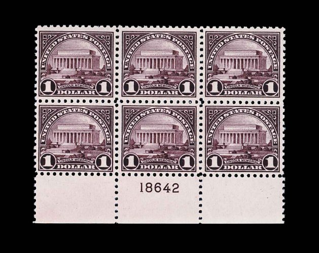 828 nhX 571 image#571, $1.00 Violet black, full bottom margin plate no. 18642 block of six, fresh and intact, deep luxuriant color, well centered, o.g., n.h., very fine. (Image) 400.00