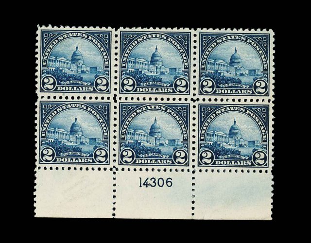 829 nhX 572 image#572, $2.00 Deep blue, full bottom margin plate no. 14306 block of six, particularly well centered and margined, o.g., n.h., couple of trivial perf. separations in sheet selvage, choice very fine. (Image) 950.00