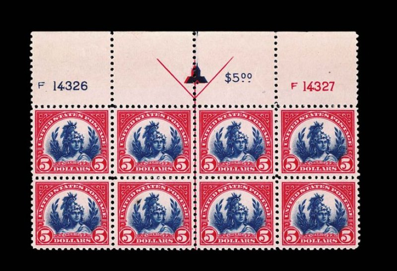 830 nhX 573 image#573, $5.00 Carmine and blue, full top margin arrow and plate nos. F14326, F14327 block of eight, extraordinarily intense rich colors and possessing outstanding centering throughout, o.g., n.h., one stamp with minor tone speck, still an extremely fine and exceptionally handsome example of this rare and popular plate block. (Image) 2,600.00