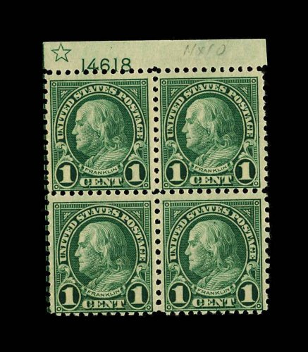 832 ogX 578 image#578, 1c Green coil waste, top margin star and plate no. 14618 block of four, deep rich color, rather well centered for this difficult and very scarce plate block, o.g., l.h., couple of natural diagonal gum creases, fine. (Image) 800.00