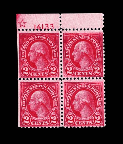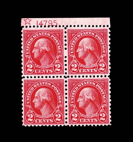 833 nhX 579 image#579, 2c Carmine coil waste, pristine top margin star and plate no. 14795 block of four, being in a condition that is rarely encountered on this difficult plate block, brilliantly fresh, radiant color, outstanding centering for a coil waste issue, o.g., n.h., extremely fine; among the finest #579 plate blocks we have seen. (Image) 850.00
