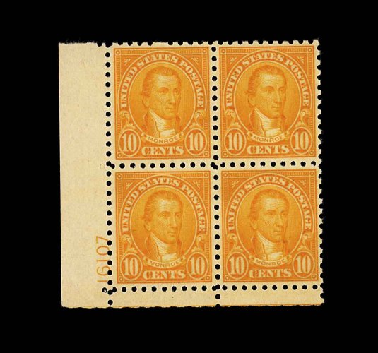 834 nhX 581-91 image#581-91, 1923-26 1c-10c Rotary press printings, perforated 10 cplt., a well matched set of scarce plate number blocks of four, all with much better centering than typically found on this difficult issue, strong fresh colors, o.g., n.h., 5c with some mount glazing on face, overall very fine. (Image) 2,622.50