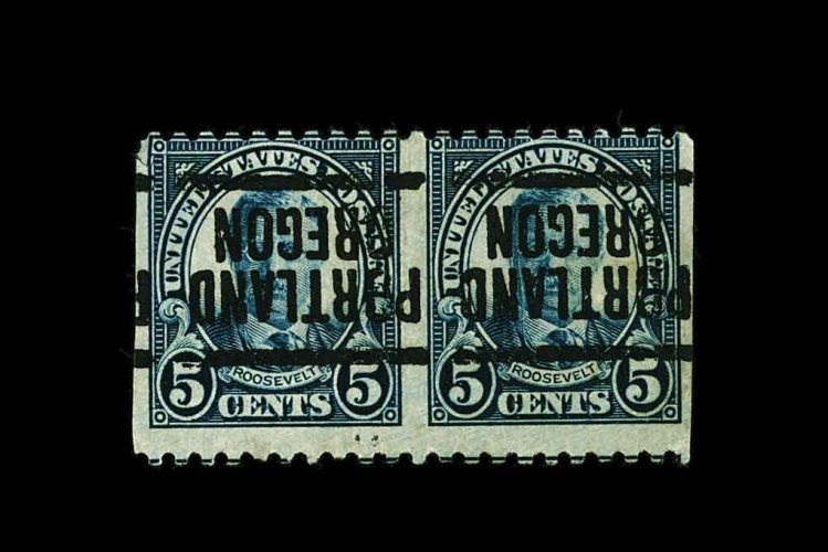835 O 586a image#586a, 5c Blue, horizontal pair, imperforate vertically, used, with inverted "Portland/Oregon" precancel, wide side margins which clearly indicates that this pair was imperforate vertically, rich color, left stamp with thin spot and a small tear at top left, fine appearance; the unique listing pair of this highly important 20th century error rarity; 2000 PF certificate. (Image) 10,000.00