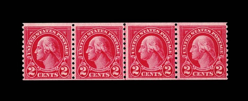 840 nh 599, 599A image#599, 599A, 2c Carmine coil, Ty. I and Ty. II combination joint line strip of four, the left pair being Ty. II stamps, while the right pair are Ty. I, rich luxuriant color, nicely centered, o.g., n.h., fine-very fine. (Image) 1,450.00+