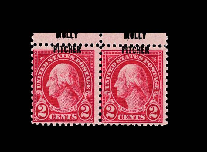861 nh 646a image#646a, 2c Molly Pitcher, "Pitcher" only, top sheet-margin horizontal pair, with the overprinted shifted to top so that only "Pitcher" portion of the overprint appears on the stamp, "Molly" appears in top sheet selvage, fresh, o.g., n.h., fine; listed but unpriced in Scott; 1979 PF certificate. (Image) Est. 150-200