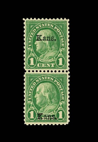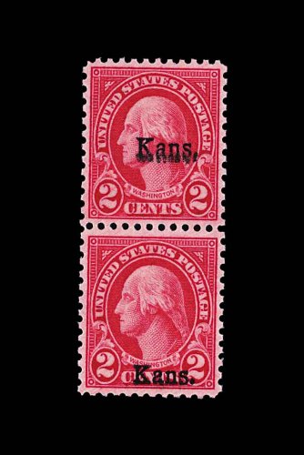 865 nh 660 image#660 var., 2c "Kans." ovpt., wide spacing, gem mint vertical pair showing the wide spacing variety of the overprint, near perfect centering, deep luxuriant color, o.g., n.h., extremely fine; much scarcer than its modest catalog would indicate; 1992 PF certificate; ex-Griffith. (Image) for hinged 55.00