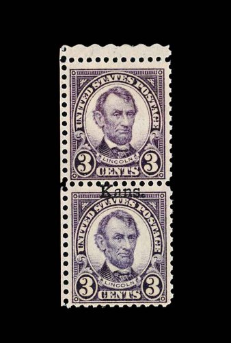 866 nh 661a image#661a, 3c "Kans." ovpt., vertical pair, one without overprint, top sheet-margin vertical pair, top stamp without overprint, o.g., n.h., fine; a rarely seen overprint error; 1977 PF certificate. (Image) for hinged 425.00