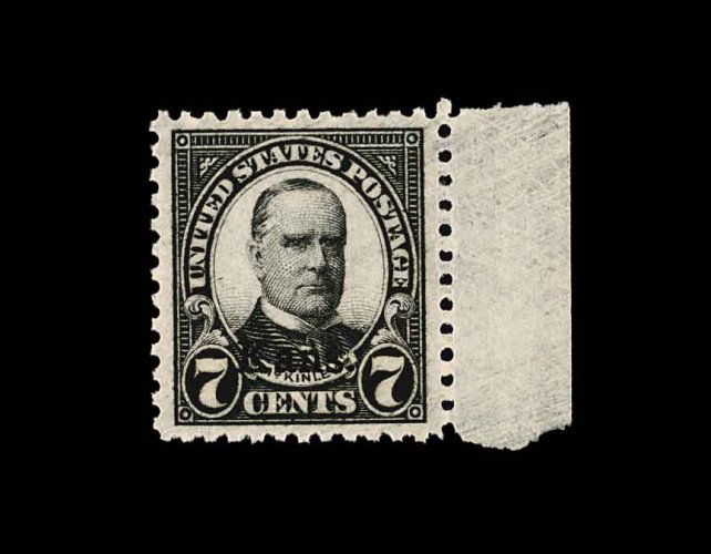 869 nh 665 image#665, 7c "Kans." ovpt., striking right sheet-margin mint example, perfectly centered within extraordinarily large margins for this or any other value from the series, strong rich color and impression, o.g., n.h., extremely fine gem; 1993 PF certificate. (Image) 45.00