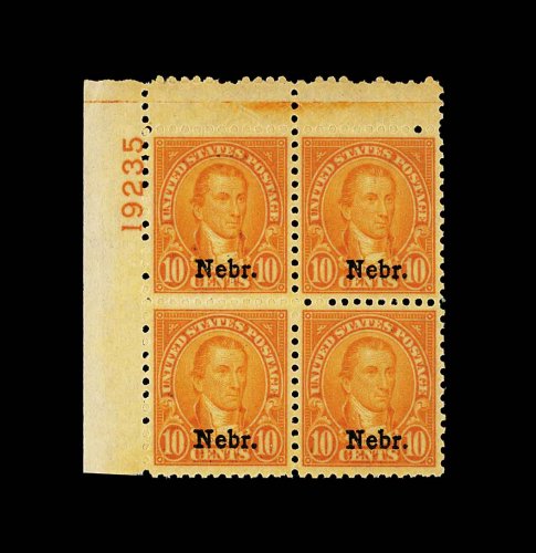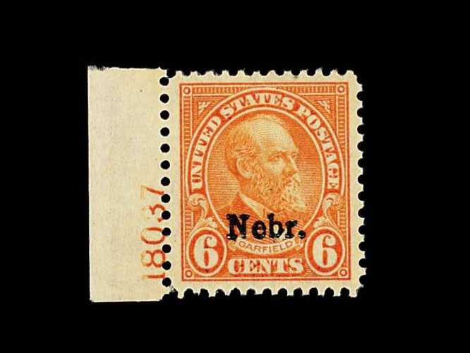 874 nh 675 image#675, 6c "Nebr." ovpt., the "perfect" mint example, being a left sheet-margin plate no. 18037 single, possessing flawless centering amid huge margins for this issue, but equally impressive is this stamp's vivid color on the whitest paper we have seen, pristine o.g., n.h., extremely fine gem; 1994 PF certificate for a block of four, this being the bottom left stamp. (Image) 72.50