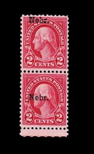 872 nh 671 var. image#671 var., 2c "Nebr." ovpt., wide spacing, bottom sheet-margin vertical pair showing wide spacing of overprint, excellent centering, o.g., n.h., extremely fine; quite scarce and undervalued in Scott; 2001 PF certificate. (Image) for hinged 57.50