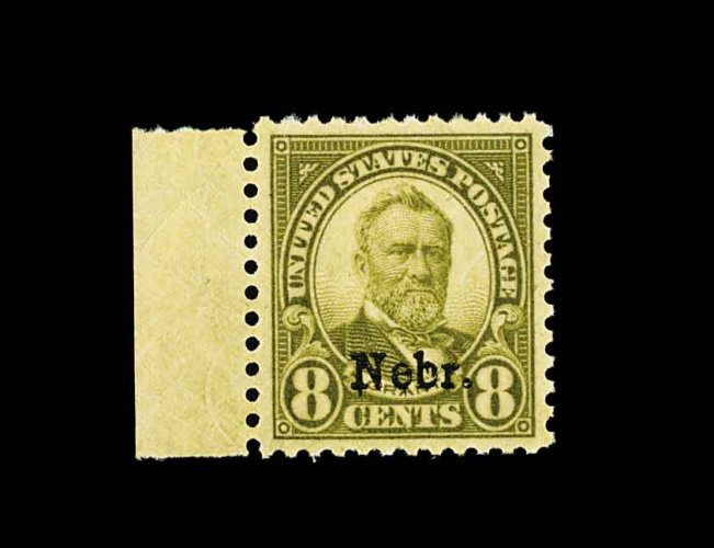 875 nh 677 image#677, 8c "Nebr." ovpt., remarkable left sheet-margin single, possessing huge margins that are most uncharacteristic of this issue, perfectly centered as well, deep rich color, o.g., n.h., an extremely fine gem; photocopy of a 1996 PF certificate for a block of four, this being the top left stamp. (Image) 57.50