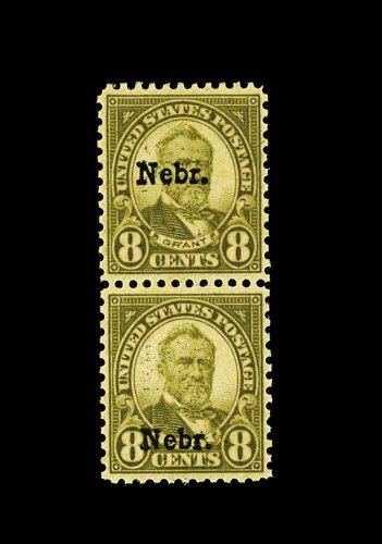 876 nh 677 var. image#677 var., 8c "Nebr." ovpt., wide spacing, brilliantly fresh vertical pair showing wide spacing of the overprint, well centered, o.g., n.h., choice very fine; quite scarce. (Image) for hinged 175.00