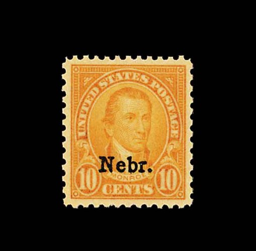 877 nh 679 image#679, 10c "Nebr." ovpt., a magnificent mint example of this difficult value, incredibly well centered within huge margins that are rarely seen on any rotary press stamp, gorgeous intense color, o.g., n.h., an extremely fine gem for the perfectionist; 1997 PF certificate for a block of four, this being the bottom right stamp. (Image) 200.00