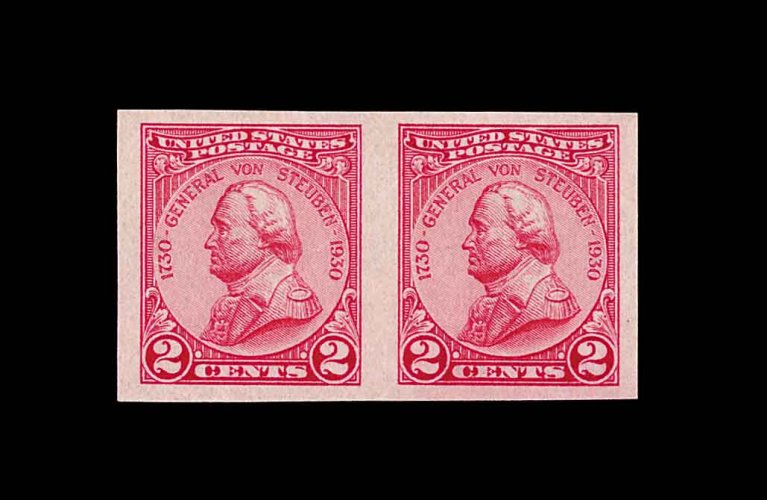 878 og 689a image#689a, 2c Von Steuben, imperforate, horizontal pair, wonderfully fresh and bright, large margins all around, o.g., lightly hinged, extremely fine; a choice example of this very rare imperforate error; only one sheet of 100 ever found its way to the collecting public through the Washington, D.C. post office, there were two other imperforate panes that were either partially used or returned to the post office in exchange for perforated sheets, leaving only 50 possible pairs for collectors; 1998 PF certificate. (Image) 2,500.00