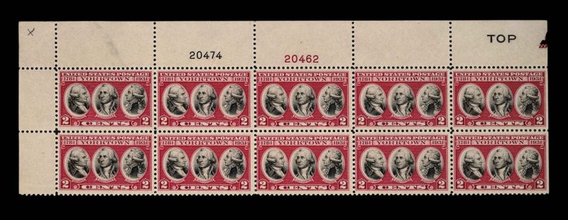 880 nhX 703b image#703b, 2c Yorktown, dark lake and black error of color, a showpiece top left corner margin "TOP" and plate nos. 20474, 20462 block of ten, being the two top rows from an error sheet, marvelously fresh, generally quite well centered, pristine o.g., n.h., fine-very fine; believed to be the largest plate number multiple known of this rare color error; 1980 and 1998 PF certificate; ex-Wampler. (Image) 6,110.00+