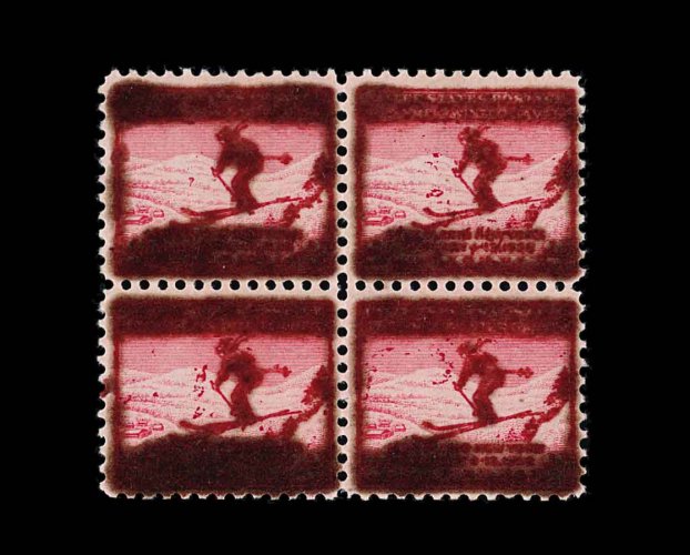 881 og/nhbl 716 var. image#716 var., 2c Olympic Winter Games, "varnish ink" variety, a most unusual mint block of four printed from an ink mixture that had far too much concentration of varnish in the ink, creating a visually stunning effect on all four stamps (see photo for full effect), well centered, o.g., top pair l.h., bottom pair n.h., very fine; a most impressive example of this distinctive printing variety; 1999 PSE certificate. (Image) Est. 500-750