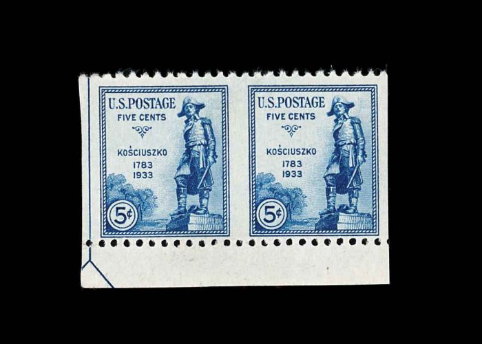882 og 734a image#734a, 5c Kosciuszko, horizontal pair, imperforate vertically, a choice example of this rare perforation error, being a bottom sheet-margin pair with an extra-wide margin at left showing a guide arrow, well centered, o.g., faintest trace of hinging, very fine; a highly desirable position pair from the unique sheet of 100. (Image) 2,250.00